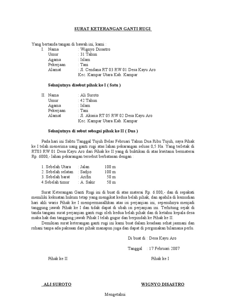 Surat Pernyataan Ganti Rugi Sebidang Tanah Pdf